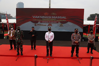 Kegiatan tersebut diselenggarakan di Lapangan Bhayangkara, Jakarta Selatan, Kamis (24/6/2021). Mereka meninjau secara langsung proses vaksinasi masyarakat mulai dari tahap pendaftaran, penyuntikan hingga observasi pasca-vaksin.